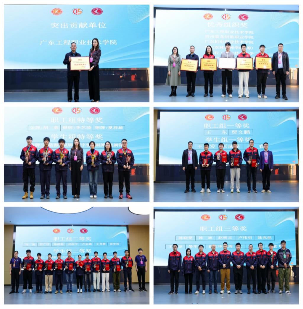 經(jīng)過激烈角逐,大賽產(chǎn)生特等獎(jiǎng)(金銀銅牌各1名)、一、二、三等獎(jiǎng)和優(yōu)勝獎(jiǎng)等若干名。人工智能學(xué)院胡蓉老師勇奪職工組特等獎(jiǎng),摘得金牌。夏梓雄老師、周文老師分別獲得特等獎(jiǎng)銅牌和三等獎(jiǎng)。2023級(jí)工業(yè)機(jī)器人技術(shù)專業(yè)學(xué)生梁朝澤、邱文昊分別獲得學(xué)生組特等獎(jiǎng)銅牌和二等獎(jiǎng),與此同時(shí),學(xué)校榮獲大賽突出貢獻(xiàn)單位和優(yōu)秀組織獎(jiǎng)。
