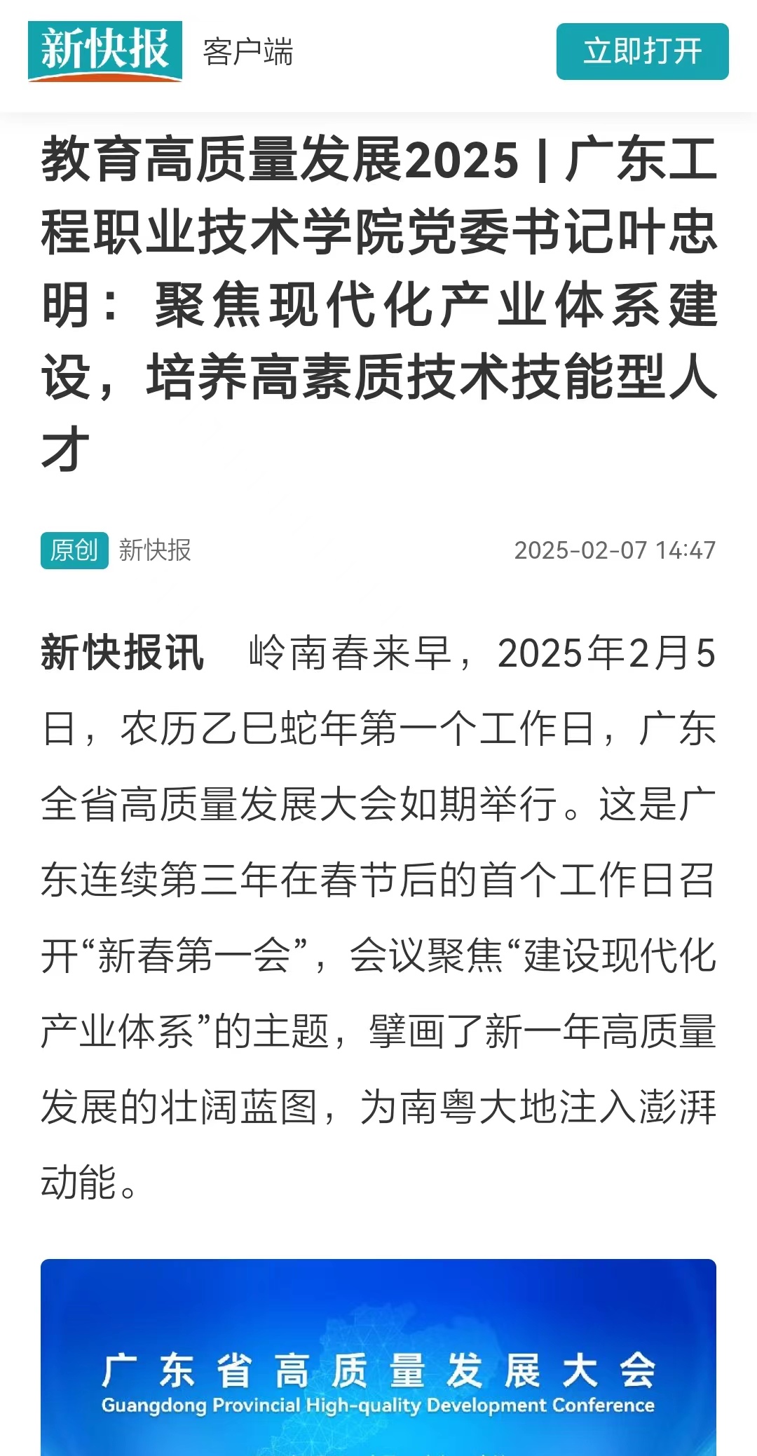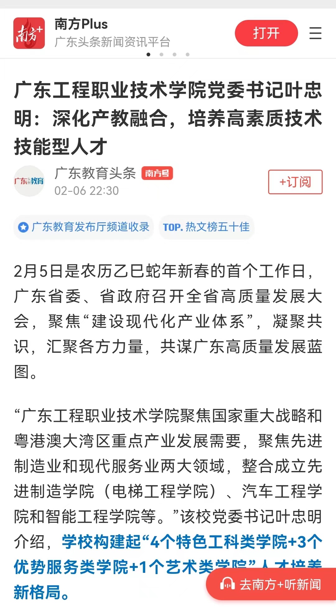 以下是《南方Plus》“廣東教育頭條”刊發(fā)專訪報(bào)道《廣東工程職業(yè)技術(shù)學(xué)院黨委書記葉忠明:深化產(chǎn)教融合,培養(yǎng)高素質(zhì)技術(shù)技能型人才》。