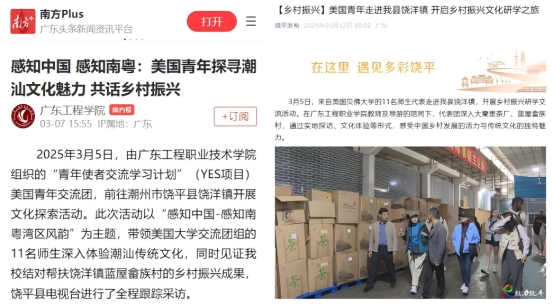 2025年3月1日至7日,美國(guó)內(nèi)布拉斯加州師生代表來粵、來校訪問。學(xué)校通過精心組織交流內(nèi)容,以文化為橋梁,以民俗為紐帶,以專業(yè)為依托,使來訪美國(guó)青少年切身感受南粵灣區(qū)風(fēng)韻,贊嘆鄉(xiāng)村振興成果,推動(dòng)中美文化教育交流走深走實(shí)。南方+客戶端、饒平發(fā)布、饒平縣電視臺(tái)等多家媒體對(duì)該項(xiàng)目進(jìn)行報(bào)道。該活動(dòng)也被中國(guó)教育國(guó)際交流協(xié)會(huì)作為中美人文交流典型成果予以重點(diǎn)宣傳,作為典型案例登載在協(xié)會(huì)《Newsletter》第13期(2025年1季度)簡(jiǎn)報(bào)上,是該批次中唯一一所高職院校。