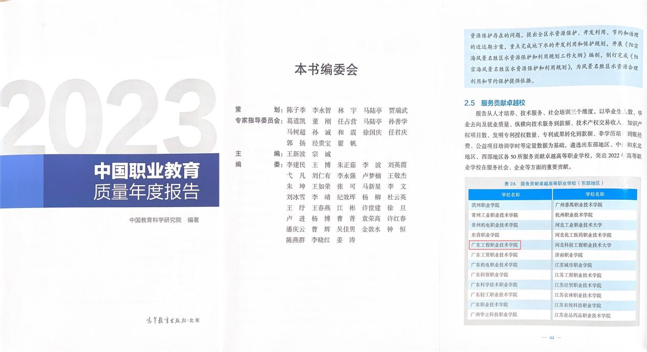 《報(bào)告》首次圍繞人才培養(yǎng)、服務(wù)貢獻(xiàn)、產(chǎn)教融合三大維度,分地域評選了全國50所卓越高等職業(yè)學(xué)校。廣東工程職業(yè)技術(shù)學(xué)院入選服務(wù)貢獻(xiàn)卓越高等職業(yè)學(xué)校(東部地區(qū))50所。