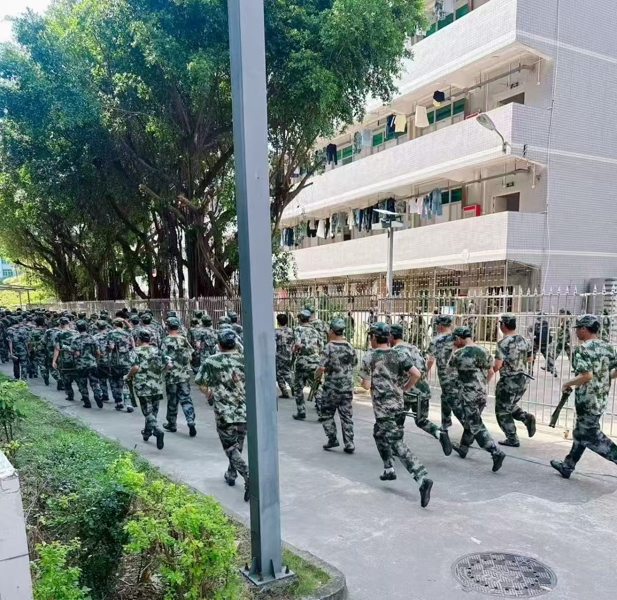 下午14點(diǎn),兩校區(qū)同時(shí)鳴起警報(bào),在報(bào)案和宿管的指揮下,各棟宿舍內(nèi)的學(xué)生俯身低頭、手捂口鼻,快速、有序疏散到學(xué)校運(yùn)動(dòng)場(chǎng),并迅速以軍訓(xùn)營(yíng)為單位集合完畢。
