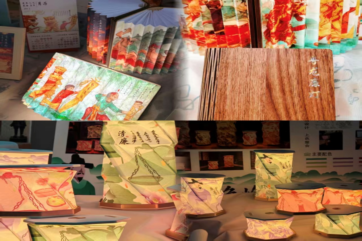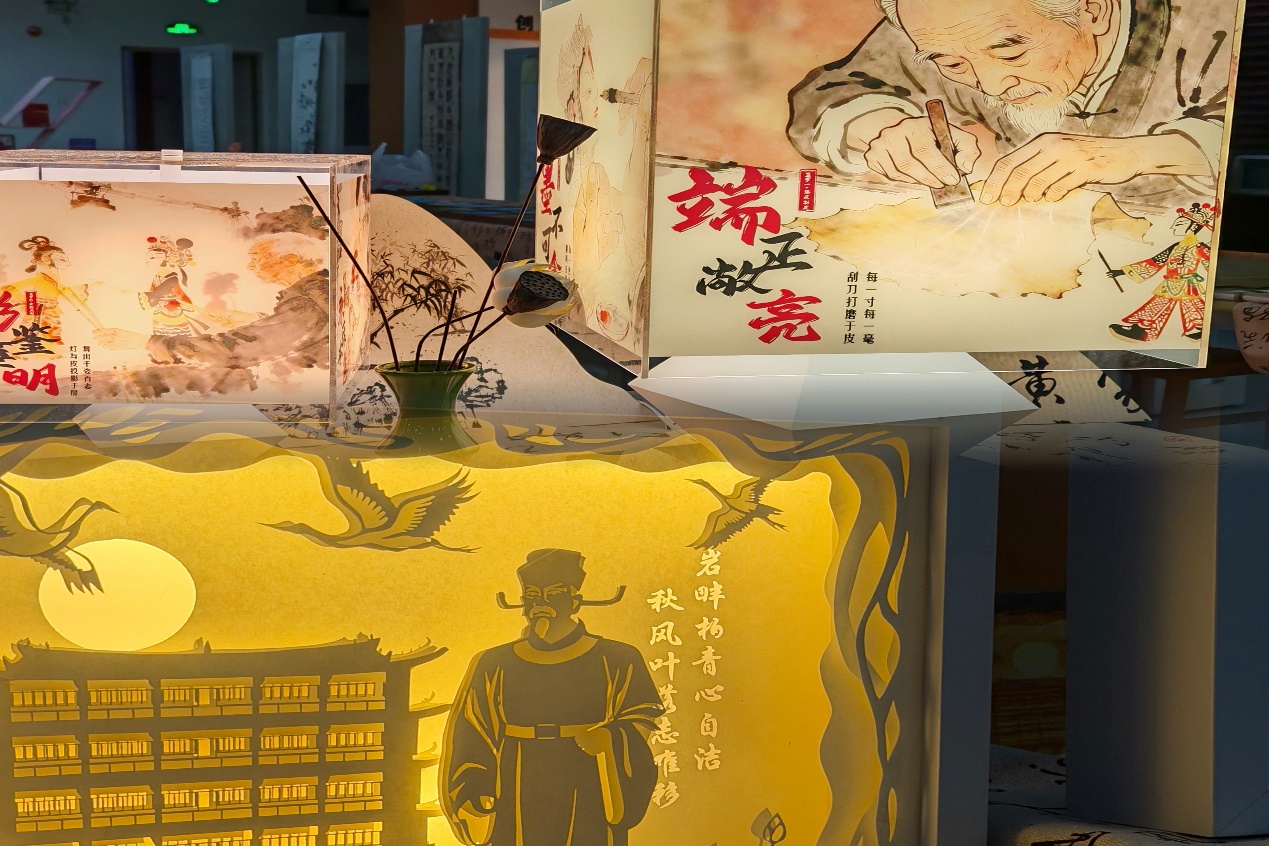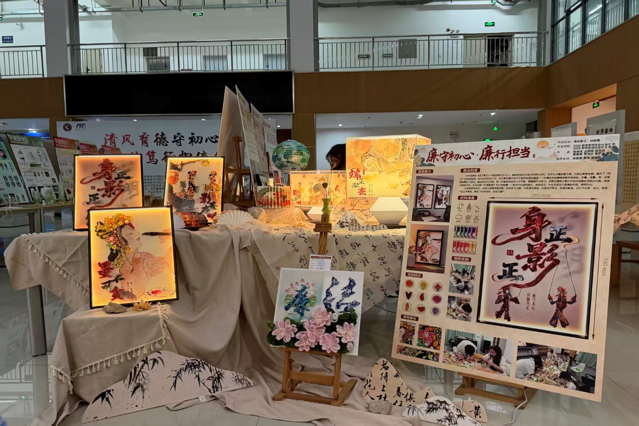 展廳內(nèi),120余件師生原創(chuàng)作品以多元藝術(shù)形式詮釋廉潔內(nèi)涵,衍紙工藝的細膩線條勾勒出“清正廉明”的抽象意象,掐絲琺瑯的鎏金光澤映照出“克己奉公”的歷史典故,剪紙紙雕的鏤空技法雕琢出“蓮潔自守”的東方美學,油畫創(chuàng)作的厚重筆觸抒發(fā)“使命在肩”的踔厲奮發(fā)。此次展覽,藝術(shù)設計學院師生更是精心創(chuàng)作了融合皮影智慧的“身正影正”系列燈藝,以嶺南特色文化代表的醒獅、龍舟等元素講述著“育人之基清廉之道”的樸實道理。
