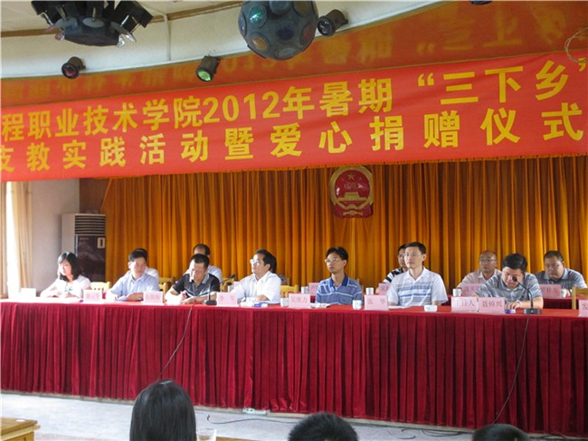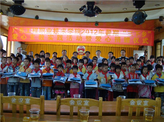 2012年7月11日上午,廣東工程職業(yè)技術(shù)學院2012年暑期"三下鄉(xiāng)"愛心支教實踐活動暨愛心捐贈儀式在云安縣南盛鎮(zhèn)政府2樓會議室舉行。出席儀式的有:學院黨委李軍副書記、云安縣委吳維力副書記、云安縣委組織部部長伍俊海、學院學生工作部部長張華、學院團委書記黃馥麗、財經(jīng)系黨總支副書記吳海彬、團云安縣委書記聶焯興、南盛鎮(zhèn)鎮(zhèn)委書記謝云生,出席儀式的還有南盛鎮(zhèn)中心小學校長、橫崗小學校長、我院36名參加支教的老師、學生,南盛鎮(zhèn)60名留守兒童等。