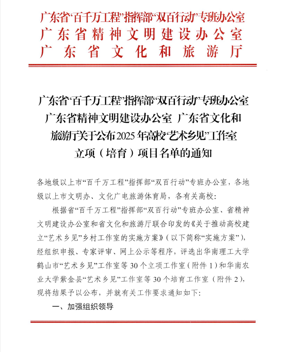 近日,廣東省“百千萬(wàn)工程”指揮部“雙百行動(dòng)”專(zhuān)班辦公室、廣東省精神文明建設(shè)辦公室及廣東省文化和旅游廳等3個(gè)單位聯(lián)合發(fā)文,由藝術(shù)設(shè)計(jì)學(xué)院院長(zhǎng)郭希主持的省級(jí)項(xiàng)目“藝術(shù)鄉(xiāng)見(jiàn)”工作室成功入選廣東省2025年高校“藝術(shù)鄉(xiāng)見(jiàn)”工作室培育項(xiàng)目名單,將與潮州市饒平縣攜手共建該工作室。