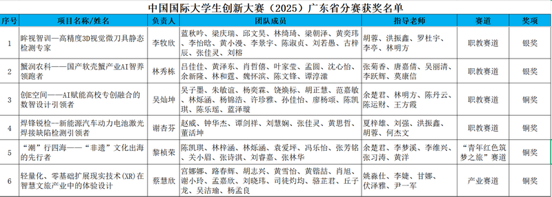 近日,廣東省教育廳下發(fā)關(guān)于公布中國(guó)國(guó)際大學(xué)生創(chuàng)新大賽(2025)廣東省分賽獲獎(jiǎng)名單的通知,在本次省賽中,經(jīng)過(guò)激烈角逐,我校參賽項(xiàng)目最終榮獲銀獎(jiǎng)2項(xiàng)、銅獎(jiǎng)4項(xiàng),獲獎(jiǎng)項(xiàng)目全面覆蓋職教賽道、“青年紅色筑夢(mèng)之旅”賽道及產(chǎn)業(yè)賽道,并榮獲省賽職業(yè)院校“學(xué)校集體獎(jiǎng)”(全省共13所高職院校獲得)。《眸視智訓(xùn)——高精度3D視覺(jué)微刀具靜態(tài)檢測(cè)專家》和《蟹潤(rùn)農(nóng)科——國(guó)產(chǎn)軟殼蟹產(chǎn)業(yè)AI智養(yǎng)領(lǐng)跑者》等2個(gè)職教賽道參賽項(xiàng)目晉級(jí)全國(guó)總決賽。