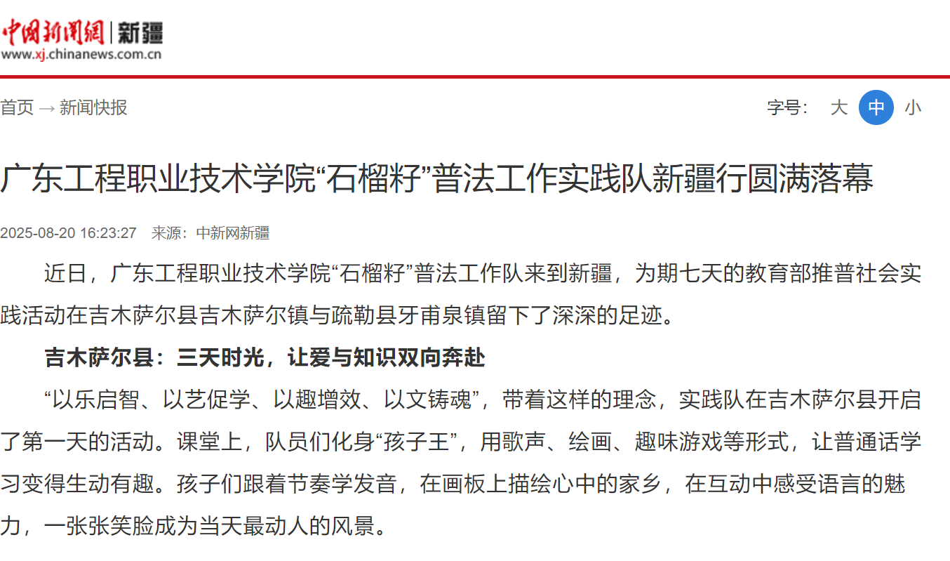 近日,廣東工程職業(yè)技術(shù)學院“石榴籽”普法工作隊來到新疆,為期七天的教育部推普社會實踐活動在吉木薩爾縣吉木薩爾鎮(zhèn)與疏勒縣牙甫泉鎮(zhèn)留下了深深的足跡。
