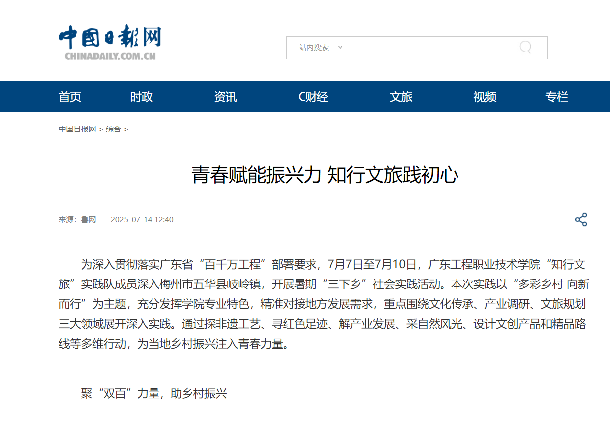為深入貫徹落實廣東省“百千萬工程”部署要求,7月7日至7月10日,廣東工程職業(yè)技術(shù)學院“知行文旅”實踐隊成員深入梅州市五華縣岐嶺鎮(zhèn),開展暑期“三下鄉(xiāng)”社會實踐活動。此次下鄉(xiāng)實踐活動,不僅是一次深入基層的調(diào)研實踐,更是一次青春與鄉(xiāng)村振興的“雙向奔赴”。實踐隊用實際行動詮釋了新時代青年的責任擔當,讓青春之花在鄉(xiāng)村振興的沃土上絢麗綻放。