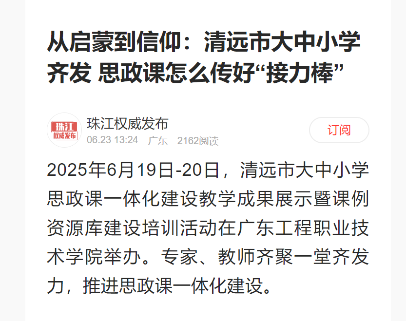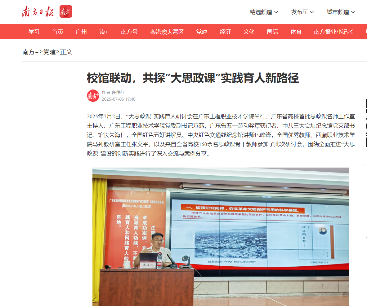 廣東工程職業(yè)技術(shù)學院聚焦“培養(yǎng)什么人、怎樣培養(yǎng)人、為誰培養(yǎng)人”這一教育的根本問題,持續(xù)深化思政課改革創(chuàng)新,將思政教育深度融入人才培養(yǎng)全過程,不斷推進“大思政課”建設,努力培養(yǎng)擔當民族復興大任的時代新人。