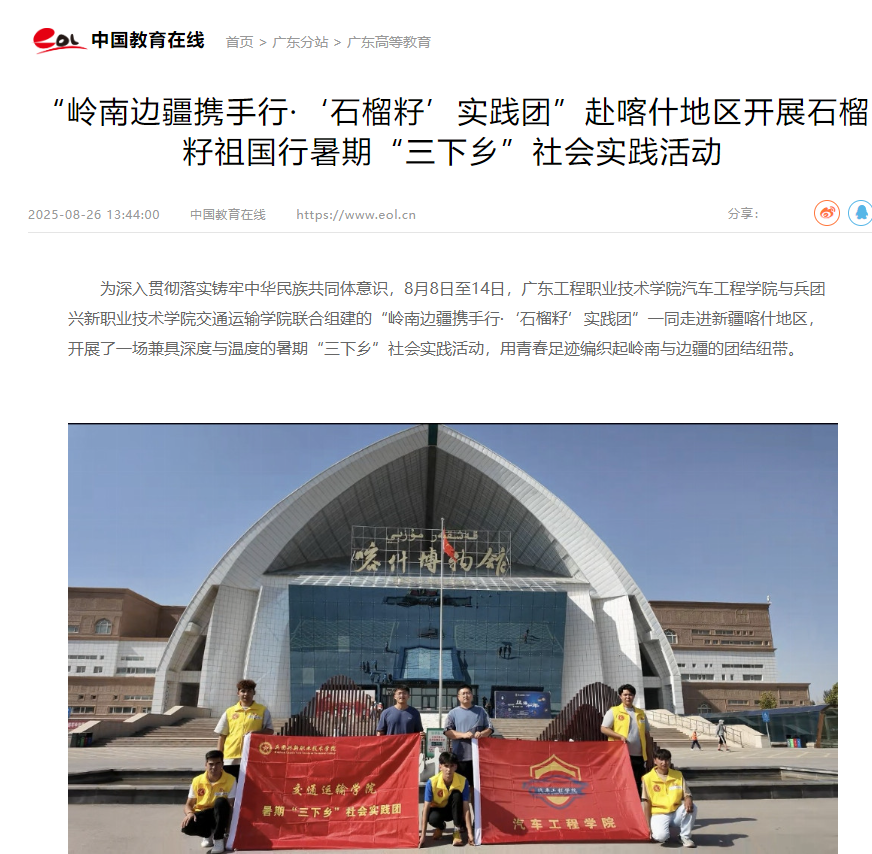 為深入貫徹落實鑄牢中華民族共同體意識,8月8日至14日,廣東工程職業(yè)技術(shù)學院汽車工程學院與兵團興新職業(yè)技術(shù)學院交通運輸學院聯(lián)合組建的“嶺南邊疆攜手行·‘石榴籽’實踐團”一同走進新疆喀什地區(qū),開展了一場兼具深度與溫度的暑期“三下鄉(xiāng)”社會實踐活動,用青春足跡編織起嶺南與邊疆的團結(jié)紐帶。