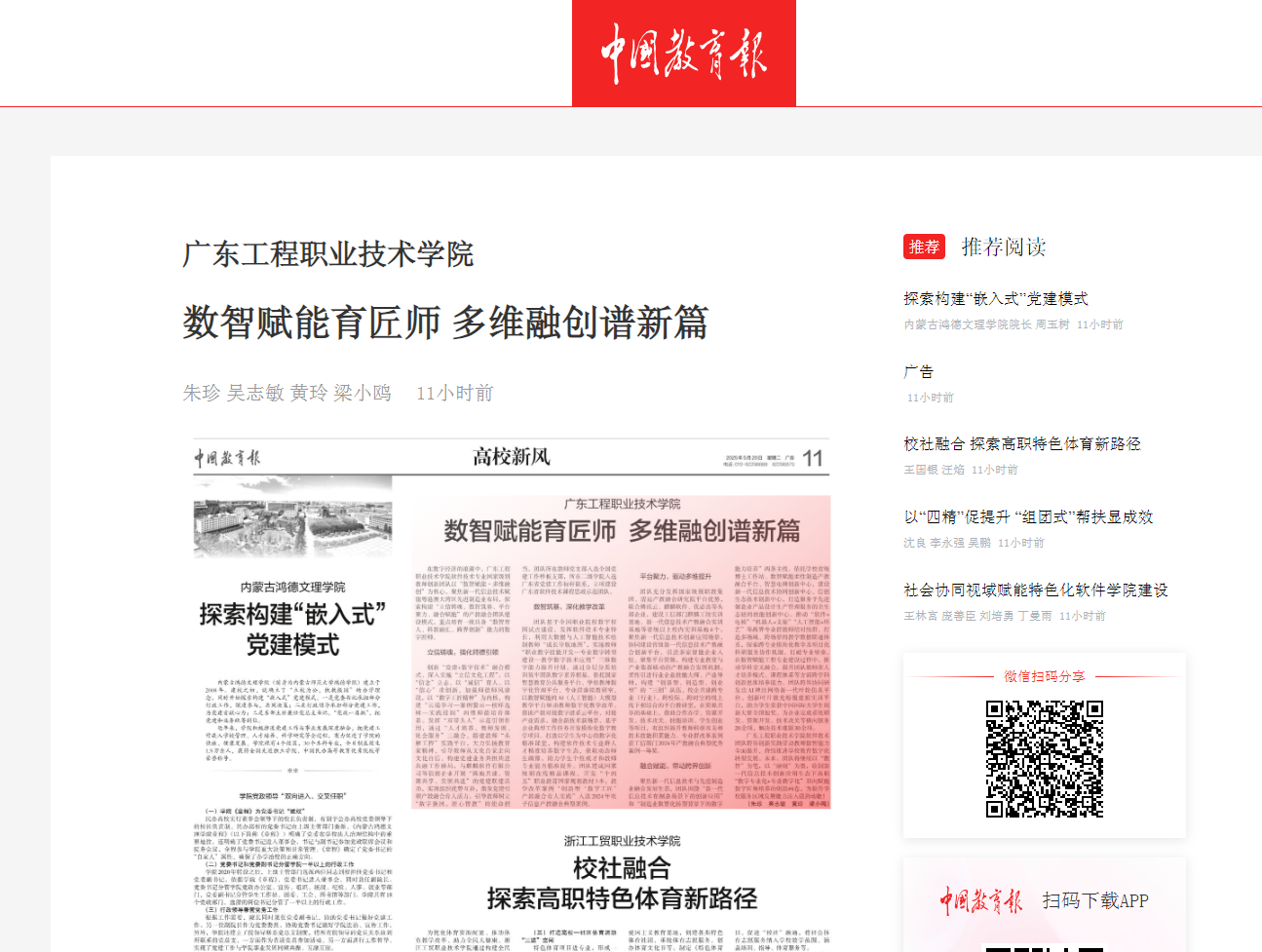 2025年9月29日《中國教育電視臺》播出我校《育“數(shù)字工匠” 鑄大國根基》,報道了我校產(chǎn)教融合相關(guān)舉措。