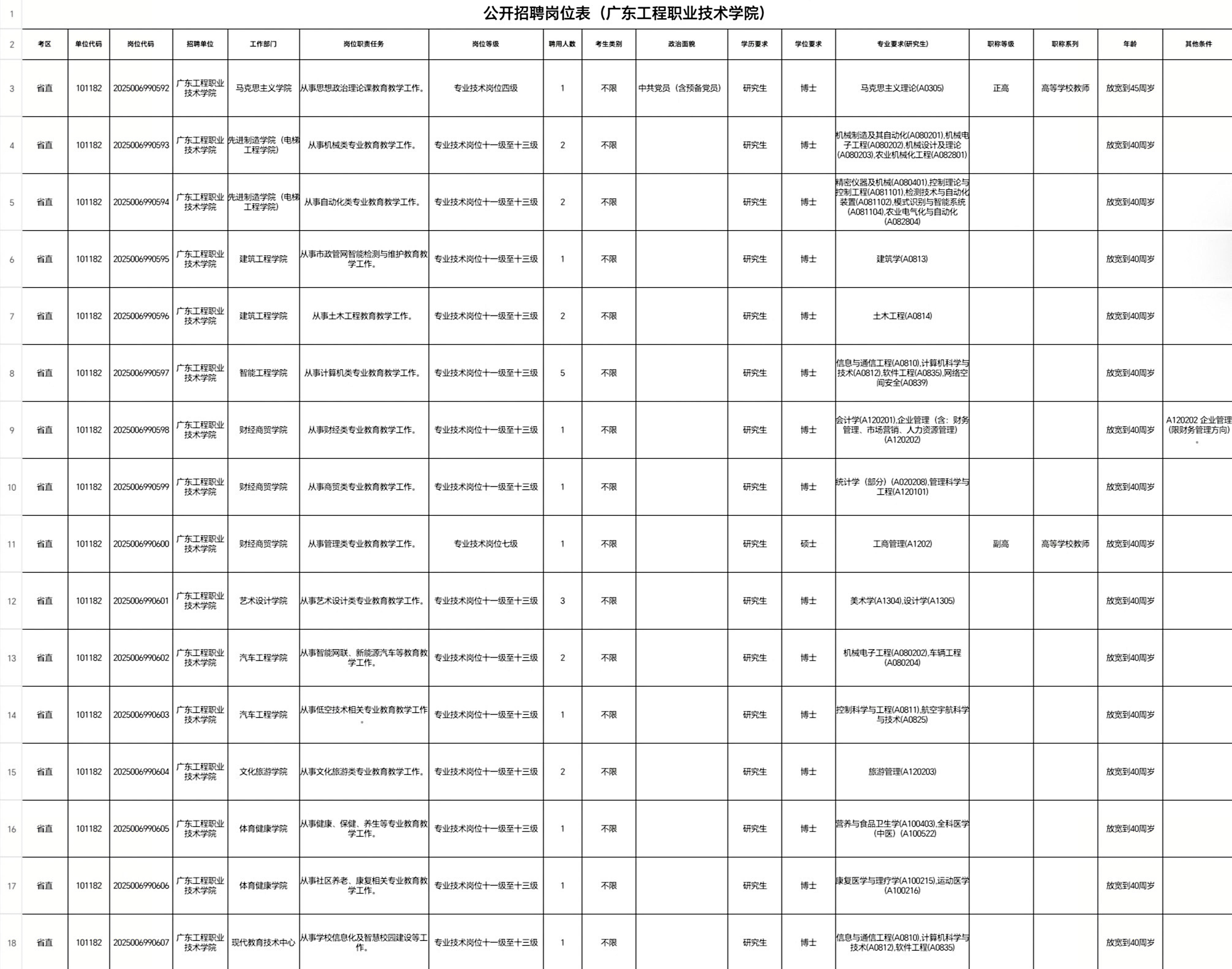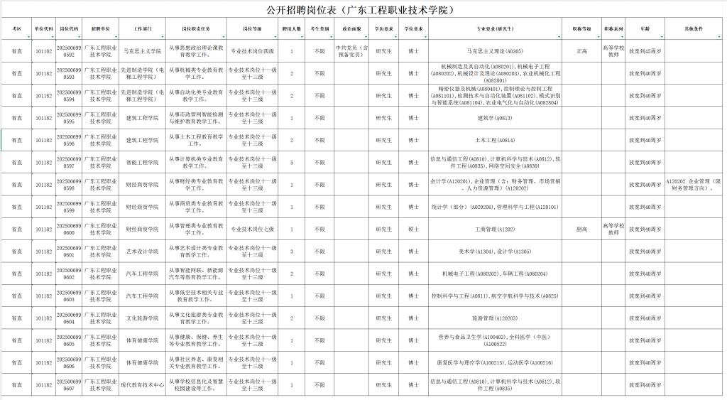 現(xiàn)因發(fā)展需要,我校參加了由中共廣東省委組織部、廣東省人力資源和社會(huì)保障廳組織開(kāi)展的廣東省事業(yè)單位2025年集中公開(kāi)招聘高層次和急需緊缺人才工作,共公開(kāi)招聘高層次人才27名,獲聘人員為事業(yè)單位編制人員,歡迎符合招聘條件的人才報(bào)考我校(歸屬考區(qū):省直,單位代碼:101182,崗位代碼:2025006990592-2025006990607),崗位具體信息如下: