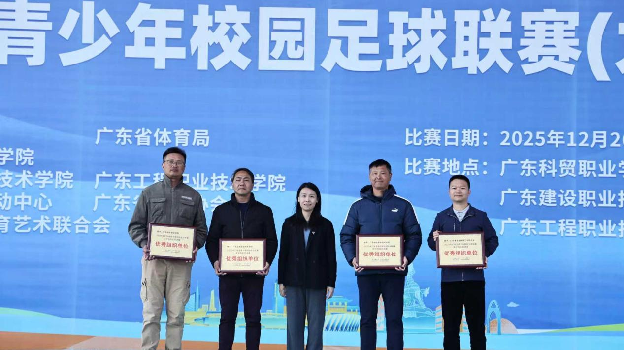 近期,2025年廣東省青少年校園足球聯(lián)賽(大學(xué)組)總決賽在清遠(yuǎn)市成功舉辦。本次賽事由廣東省教育廳與廣東省體育局聯(lián)合主辦,廣東科貿(mào)職業(yè)學(xué)院承辦,廣東工程職業(yè)技術(shù)學(xué)院、廣東建設(shè)職業(yè)技術(shù)學(xué)院、廣東省足球運動中心、廣東省足球協(xié)會、廣東省學(xué)生體育藝術(shù)聯(lián)合會共同協(xié)辦。我校作為協(xié)辦單位之一,圓滿完成了賽事各項組織保障工作,受到廣東省教育廳和廣東省體育局的高度肯定,授予“優(yōu)秀組織單位”稱號。
