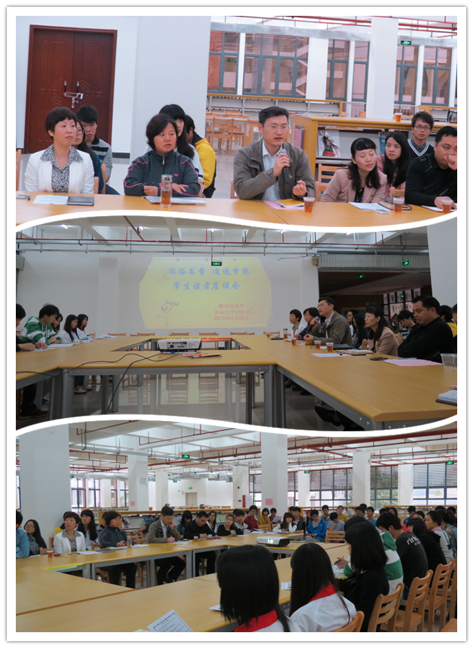 座談會氣氛融洽,同學(xué)們暢所欲言,積極闡發(fā)自己的讀書感情,并代表本院系的同學(xué)們就圖書館的館藏建設(shè)、借閱服務(wù)等方面提出不少中肯的意見和建議。