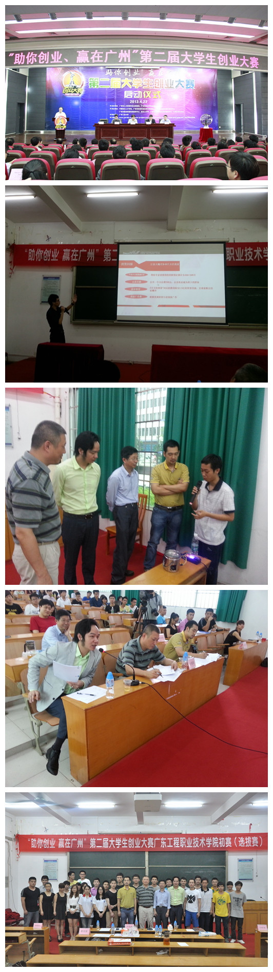 5月16日下午,"助你創(chuàng)業(yè)、贏在廣州"第二屆大學(xué)生創(chuàng)業(yè)大賽廣東工程職業(yè)技術(shù)學(xué)院初賽(選拔賽)在我院綜合樓102學(xué)術(shù)報(bào)告廳隆重舉行。本次大賽共有9個(gè)院系的24支有志于創(chuàng)業(yè)的團(tuán)隊(duì)接近200名同學(xué)報(bào)名參賽。此次校內(nèi)選拔賽,為了提高實(shí)戰(zhàn)效果,嚴(yán)格依照省教育廳的通知要求,從比賽內(nèi)容到評委確定都與大賽對接。比賽項(xiàng)目分為創(chuàng)業(yè)(商業(yè))計(jì)劃書、ppt演示參賽作品和公開答辯三個(gè)部分。第一次聘請校外企業(yè)界人士作為評委。各參賽團(tuán)隊(duì)通過集體亮相及PPT演示和就評委提出的問題進(jìn)行答辯等環(huán)節(jié)的不俗表現(xiàn),使現(xiàn)場氣氛十分活躍。經(jīng)過激烈的角逐,評委對20個(gè)參賽項(xiàng)目進(jìn)行了現(xiàn)場打分并當(dāng)場公布了獲得前10名的團(tuán)隊(duì),并將在前10名的團(tuán)隊(duì)中挑選出3個(gè)項(xiàng)目參加省里的大賽。