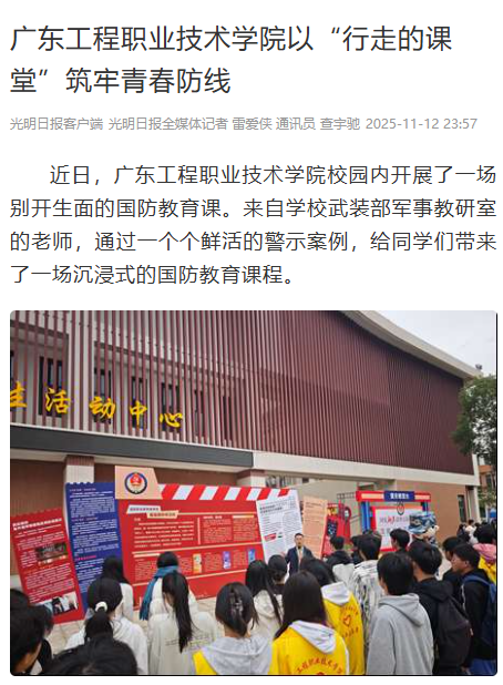 近日,廣東工程職業(yè)技術(shù)學(xué)院校園內(nèi)開展了一場(chǎng)別開生面的國(guó)防教育課。來(lái)自學(xué)校武裝部軍事教研室的老師,通過一個(gè)個(gè)鮮活的警示案例,給同學(xué)們帶來(lái)了一場(chǎng)沉浸式的國(guó)防教育課程。
