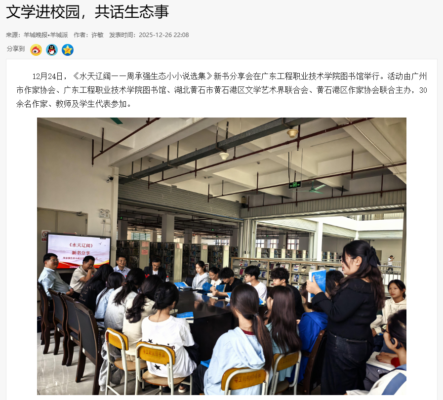 12月24日,《水天遼闊——周承強(qiáng)生態(tài)小小說選集》新書分享會在廣東工程職業(yè)技術(shù)學(xué)院圖書館舉行。活動由廣州市作家協(xié)會、廣東工程職業(yè)技術(shù)學(xué)院圖書館、湖北黃石市黃石港區(qū)文學(xué)藝術(shù)界聯(lián)合會、黃石港區(qū)作家協(xié)會聯(lián)合主辦,30余名作家、教師及學(xué)生代表參加。