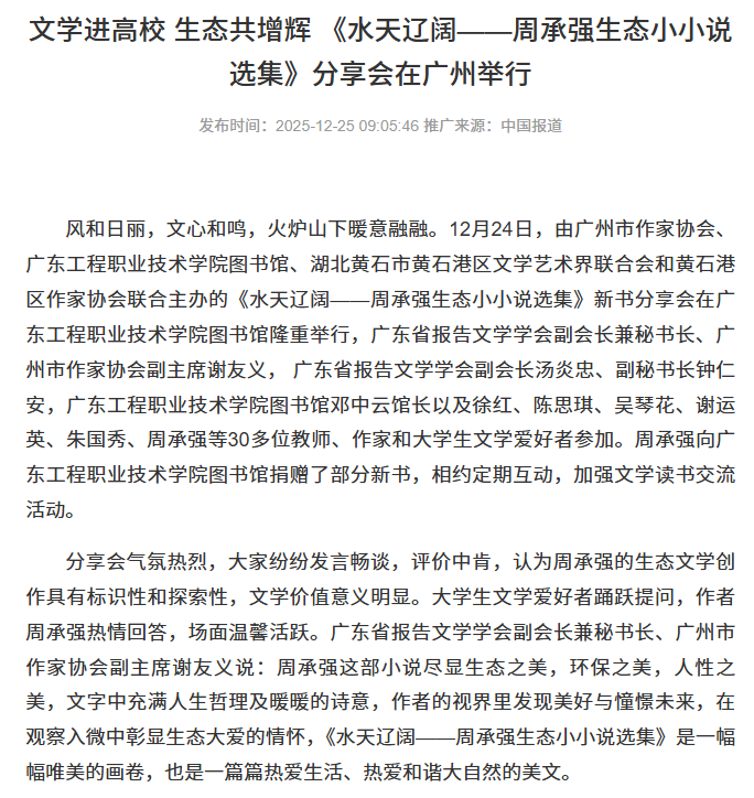 廣東省報告文學學會副秘書長鐘仁安說,周承強用筆描繪美麗生態(tài)圖卷,穿行于新時代火熱生活,人與自然共情的精神吟頌,賦予了作品更多家國情懷,以及人與自然和諧共生的崇高理念,是用文字丈量生態(tài)的行動書,展示了一種生態(tài)文學新視角,開卷有益,容易引起共鳴共情。該院現(xiàn)代通信技術(shù)專業(yè)24級大學生朱國秀感慨:與作者面對面交流,加深了對作品主題的深刻理解,提高了閱讀效果,對我們理工科學生來說非常重要,希望今后多舉辦此類活動。