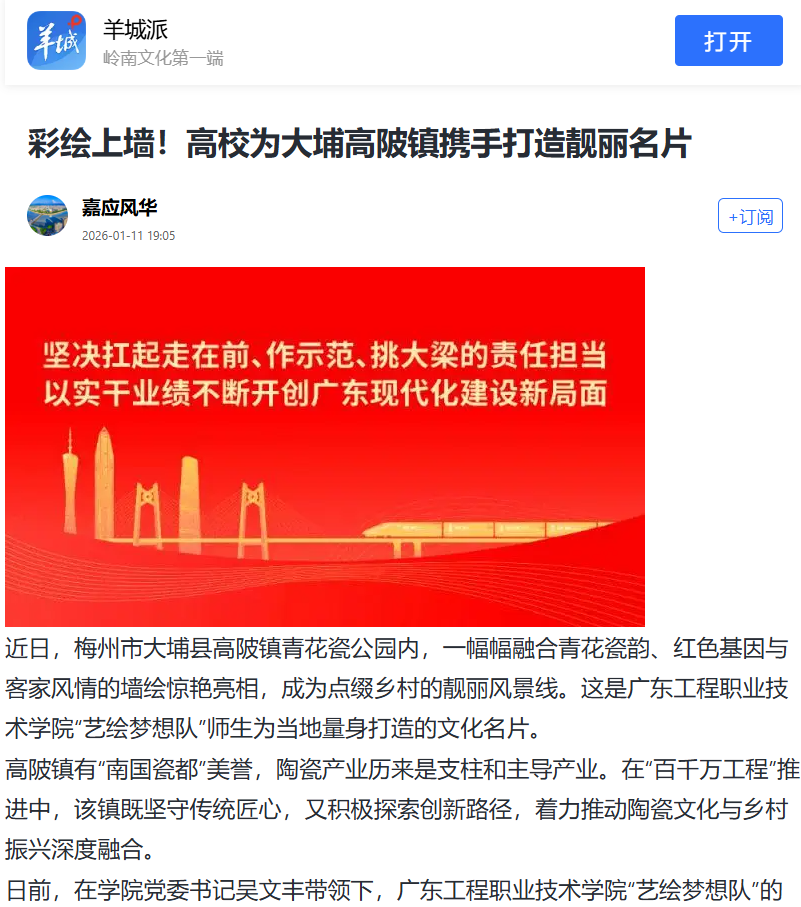 近日,梅州市大埔縣高陂鎮(zhèn)青花瓷公園內(nèi),一幅幅融合青花瓷韻、紅色基因與客家風情的墻繪驚艷亮相,成為點綴鄉(xiāng)村的靚麗風景線。這是廣東工程職業(yè)技術(shù)學院“藝繪夢想隊”師生為當?shù)亓可泶蛟斓奈幕?/p>
