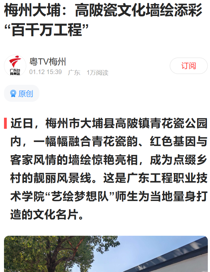 近日,梅州市大埔縣高陂鎮(zhèn)青花瓷公園內(nèi),一幅幅融合青花瓷韻、紅色基因與客家風(fēng)情的墻繪驚艷亮相,成為點(diǎn)綴鄉(xiāng)村的靚麗風(fēng)景線。這是廣東工程職業(yè)技術(shù)學(xué)院“藝?yán)L夢(mèng)想隊(duì)”師生為當(dāng)?shù)亓可泶蛟斓奈幕?/span>