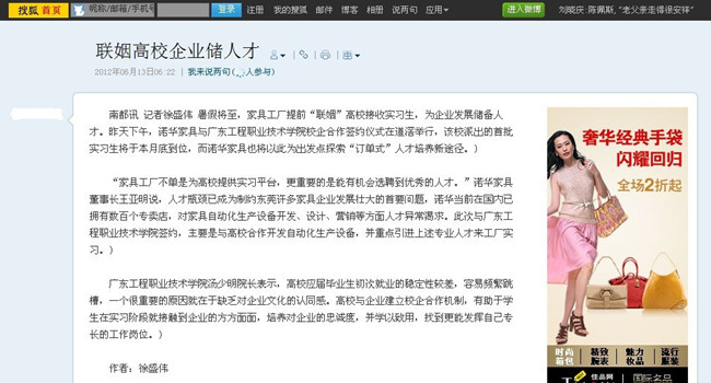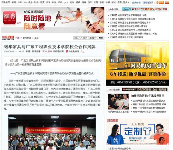 6月12日,廣東工程職業(yè)技術(shù)學(xué)院與諾華家具公司校外實(shí)訓(xùn)基地簽約授牌儀式在東莞諾華家具公司一樓影院廳隆重召開。該活動(dòng)引起了各大媒體的高度關(guān)注,南方都市報(bào)、網(wǎng)易、搜狐網(wǎng)、東莞日?qǐng)?bào)、東莞時(shí)間網(wǎng)等主流媒體爭(zhēng)相作了相關(guān)報(bào)道,對(duì)我校的校企合作模式作出充分肯定。