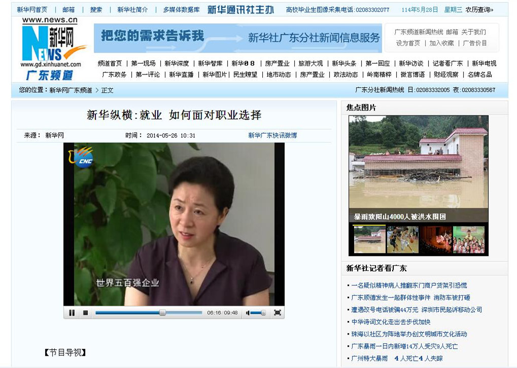 近期,各大媒體對我校大學(xué)生就業(yè)創(chuàng)業(yè)所取得的成績表示極大的關(guān)注和肯定。新華社記者兩次來校對就業(yè)創(chuàng)業(yè)工作進(jìn)行深入采訪。4月26日,《新華縱橫》欄目播出了該社記者采訪學(xué)校辦學(xué)情況和專訪劉文清書記的報道。視頻網(wǎng)址:http://www.gd.xinhuanet.com/newscenter/2014-05/26/c_1110850888.htm