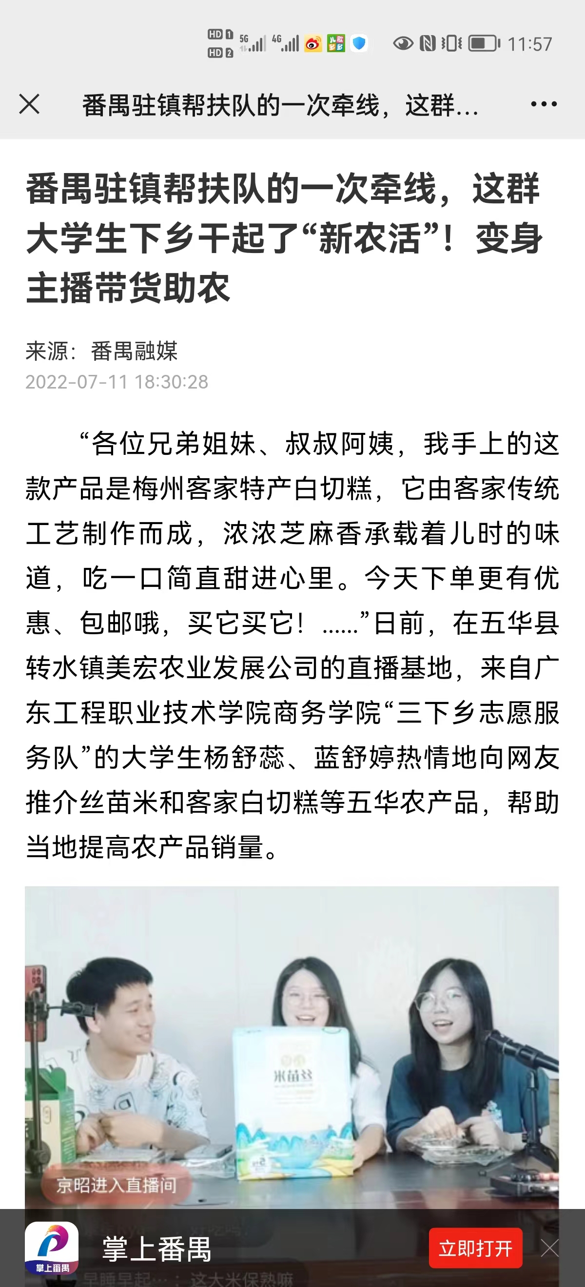 近段時(shí)間,番禺區(qū)派駐五華縣轉(zhuǎn)水鎮(zhèn)幫扶工作隊(duì)通過與廣東工程職業(yè)技術(shù)學(xué)院商務(wù)學(xué)院(電子商務(wù)專業(yè)和物流專業(yè))“三下鄉(xiāng)志愿服務(wù)隊(duì)”溝通時(shí)發(fā)現(xiàn),這些大學(xué)生具有一定的專業(yè)優(yōu)勢(shì),便于7月8日至10日安排他們來五華縣轉(zhuǎn)水鎮(zhèn)參加社會(huì)實(shí)踐活動(dòng)。在美宏農(nóng)業(yè)發(fā)展公司的直播基地,學(xué)生們憑著良好的專業(yè)基礎(chǔ)和綜合素質(zhì),很快就掌握了直播帶貨的技巧,在線觀看人數(shù)迅速上升,提升農(nóng)產(chǎn)品銷售“熱度”;在新豐寨景區(qū),學(xué)生們制作短視頻,通過抖音平臺(tái)向廣大網(wǎng)民展示休閑農(nóng)業(yè)旅游景區(qū),激發(fā)網(wǎng)友來景區(qū)旅游觀光的欲望。“三下鄉(xiāng)志愿服務(wù)隊(duì)”還以“農(nóng)村電商發(fā)展現(xiàn)狀與展望”為主題,走訪政府機(jī)關(guān)、企業(yè)、農(nóng)戶、居民,發(fā)放調(diào)查問卷;宣傳健康知識(shí)、急救知識(shí),幫助農(nóng)戶拔草、搶收花生和稻谷等,收獲滿滿。