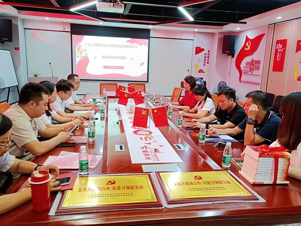 參觀了愛國主義教育基地后,廣東玖鴻教育研究集團(tuán)黨支部與廣東工程職業(yè)技術(shù)學(xué)院財(cái)經(jīng)學(xué)院黨總支開展了黨建共建座談。座談會(huì)上,吳麗清給支部黨員講黨課,雙方分別介紹了黨支部工作開展情況探討,舉行了黨組織共建結(jié)對(duì)簽約儀式和互贈(zèng)書籍、牌匾等活動(dòng),重點(diǎn)圍繞黨建與業(yè)務(wù)融合、紅色文化建設(shè)、高等教育、技能培訓(xùn)等專題進(jìn)行了深入交流。雙方一致表示,將以黨建共建活動(dòng)為契機(jī),結(jié)合各自的資源優(yōu)勢(shì),在高等教育、技能培訓(xùn)等領(lǐng)域加強(qiáng)合作,共同探索職業(yè)教育普及新路徑。