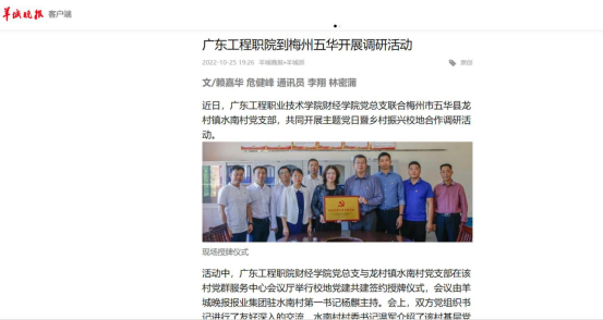 今年暑假,我院11名師生組成的“德誠才精”暑假三下鄉(xiāng)社會實踐隊來到梅州市五華縣龍村鎮(zhèn)水南村,開展為期6天的鄉(xiāng)村振興暑假大學生社會實踐服務活動,通過調(diào)研、直播助農(nóng)、支教、慰問、座談等形式助力鄉(xiāng)村振興。暑假“三下鄉(xiāng)”社會實踐活動與水南村達成了良好的合作效果,也奠定了下一步的合作意向。10月13-14日,財經(jīng)學院黨總支聯(lián)合梅州市五華縣龍村鎮(zhèn)水南村黨支部,共同開展“喜迎黨的二十大·結(jié)對共譜鄉(xiāng)村振興新篇章”主題黨日暨鄉(xiāng)村振興校地合作調(diào)研活動,該活動獲得《羊城晚報》報道。