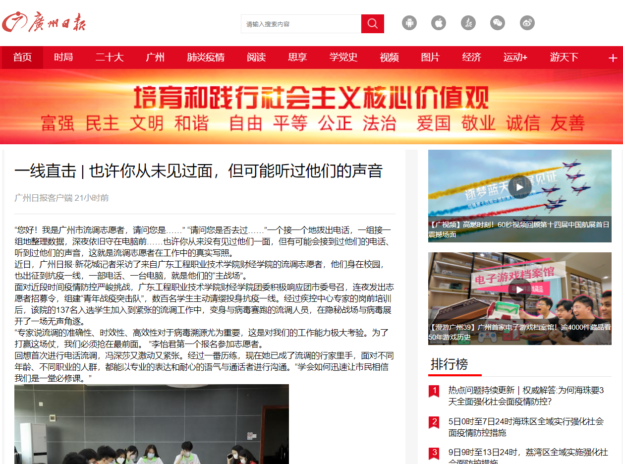 面對近段時間疫情防控嚴峻挑戰(zhàn),廣東工程職業(yè)技術學院財經(jīng)學院團委積極響應團市委號召,連夜發(fā)出志愿者招募令,組建“青年戰(zhàn)疫突擊隊”,數(shù)百名學生主動請纓投身抗疫一線。經(jīng)過疾控中心專家的崗前培訓后,該院的137名入選學生加入到緊張的流調工作中,變身與病毒賽跑的流調人員,在隱秘戰(zhàn)場與病毒展開了一場無聲角逐。