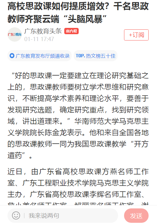 近日,由廣東省高校思政課方燕名師工作室、廣東工程職業(yè)技術學院馬克思主義學院主辦,廣東省高校思政課李輝名師工作室、詹小美名師工作室、解麗霞名師工作室、謝迪斌名師工作室、程京武名師工作室、關鋒名師工作室、杜奮根名師工作室、劉志山名師工作室、曹群名師工作室、劉靜名師工作室、李霞名師工作室以及人民公開課協(xié)辦的“黨的二十大精神融入高校思政課”名師論壇暨教學展示活動在廣州以線上會議的形式召開。會議邀請來自全國各地的38位高校思政課名師名家圍繞重點把握、有機融入課程等多個議題進行深入探討,1000多名高校思政課教師相聚云端,共同學習提升。