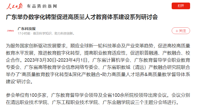 為服務(wù)國家創(chuàng)新驅(qū)動(dòng)發(fā)展要求,順應(yīng)全球新一輪科技革命及產(chǎn)業(yè)變革趨勢,促進(jìn)高校高質(zhì)量教育水平發(fā)展,推進(jìn)教育數(shù)字化轉(zhuǎn)型,提高職業(yè)教育適應(yīng)性,促進(jìn)職普融通、產(chǎn)教融合、校企合作。2023年3月30日-2023年4月1日,廣東省計(jì)算機(jī)學(xué)會(huì)、廣東教育督導(dǎo)學(xué)會(huì)職業(yè)教育專委會(huì)、廣東省高等教育學(xué)會(huì)信息網(wǎng)絡(luò)專委會(huì)、廣東省職教城(清遠(yuǎn))產(chǎn)教融合研究院聯(lián)合舉辦了“高質(zhì)量教育數(shù)字化轉(zhuǎn)型&深化產(chǎn)教融合?助力高質(zhì)量人才培養(yǎng)&高質(zhì)量教學(xué)督導(dǎo)體系建設(shè)“研討會(huì)。