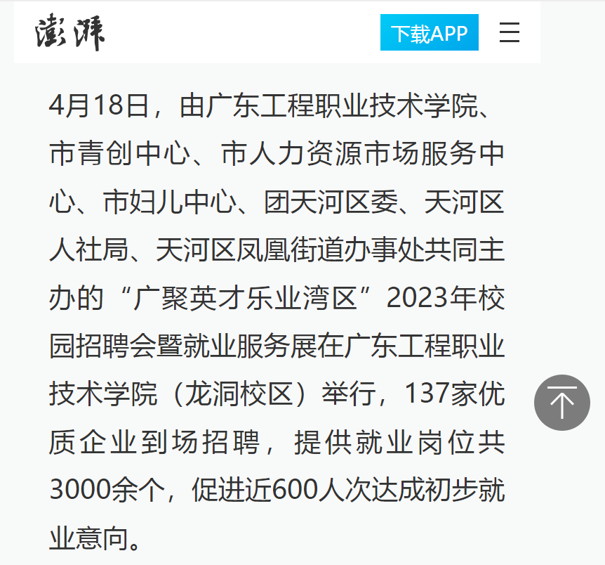 4月18日,由廣東工程職業(yè)技術學院、市青創(chuàng)中心、市人力資源市場服務中心、市婦兒中心、團天河區(qū)委、天河區(qū)人社局、天河區(qū)鳳凰街道辦事處共同主辦的“廣聚英才樂業(yè)灣區(qū)”2023年校園招聘會暨就業(yè)服務展在廣東工程職業(yè)技術學院(龍洞校區(qū))舉行,137家優(yōu)質(zhì)企業(yè)到場招聘,提供就業(yè)崗位共3000余個,促進近600人次達成初步就業(yè)意向。