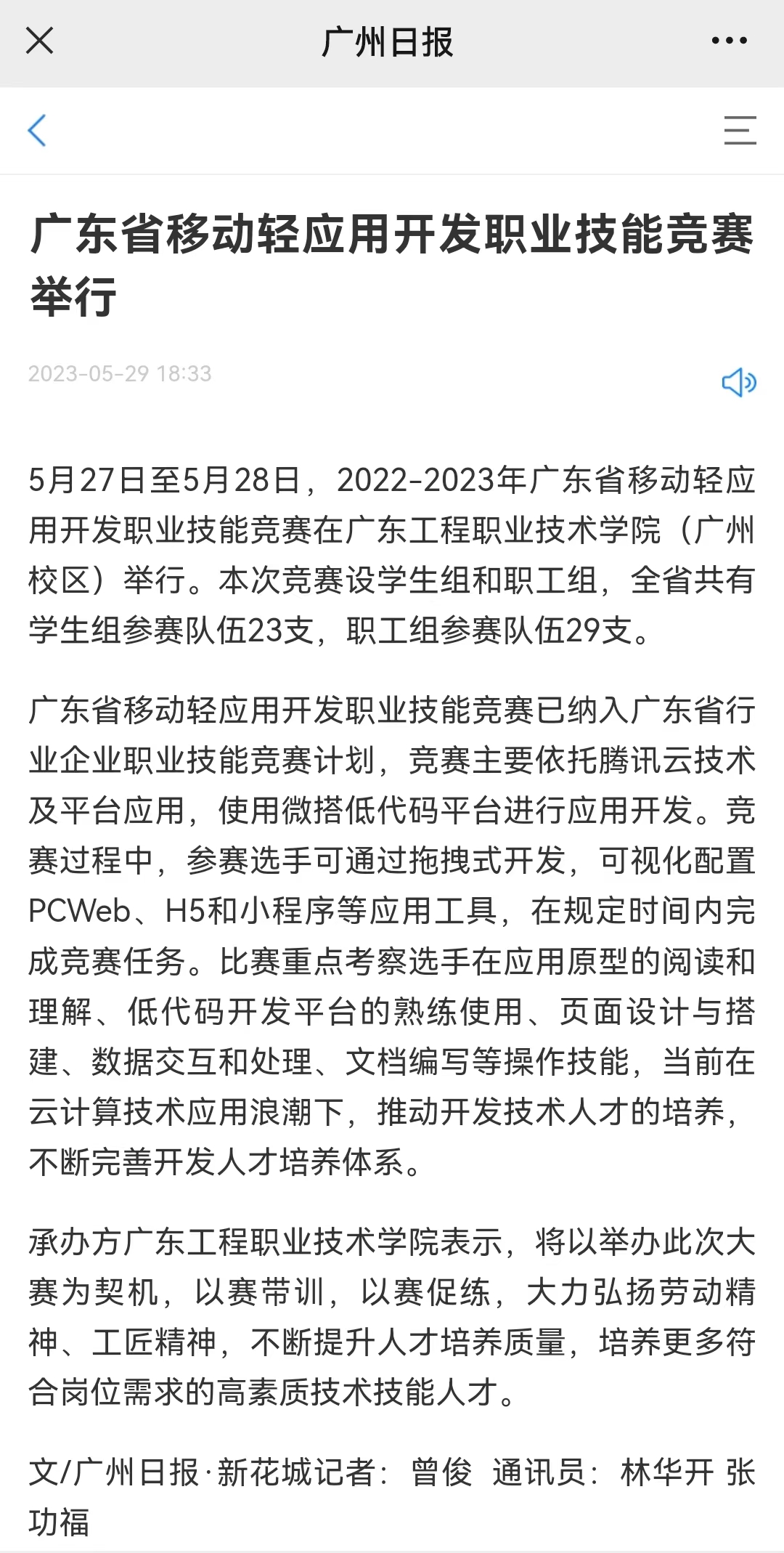 5月27日至5月28日,2022-2023年廣東省移動輕應(yīng)用開發(fā)職業(yè)技能競賽在廣東工程職業(yè)技術(shù)學(xué)院(廣州校區(qū))舉行。本次競賽設(shè)學(xué)生組和職工組,全省共有學(xué)生組參賽隊伍23支,職工組參賽隊伍29支。