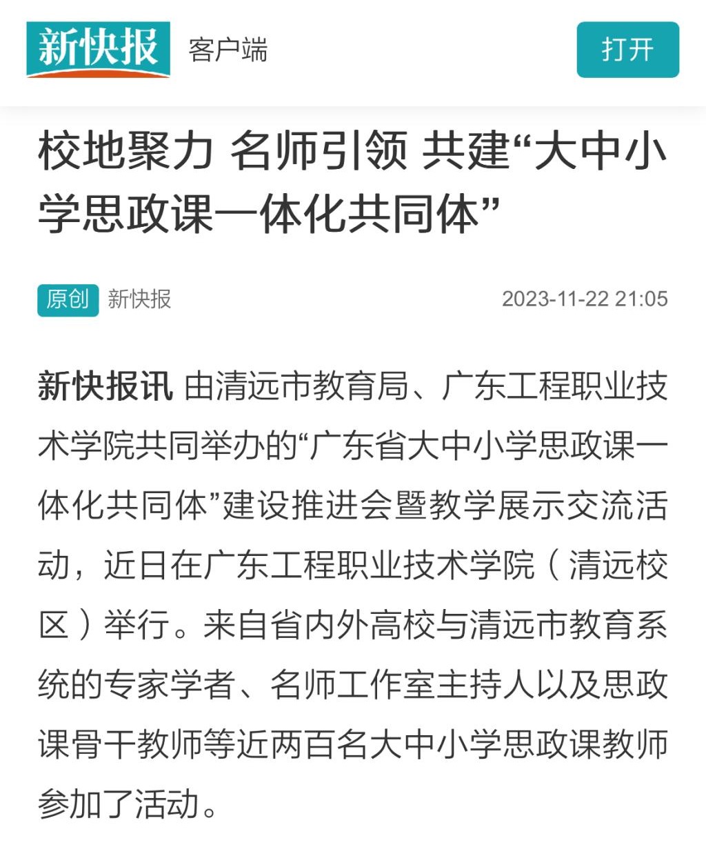 據(jù)介紹,廣東工程職業(yè)技術學院作為牽頭高校,與清遠市教育局校地共建大中小學思政課一體化共同體項目,旨在通過發(fā)揮和整合省內外專家學者和清遠市各級學校教研員、思政課名師的力量,加強對廣東省特別是清遠市大中小學思政課一體化建設的研究、指導和服務,切實打造市域特色的大中小學思政課一體化共同體。