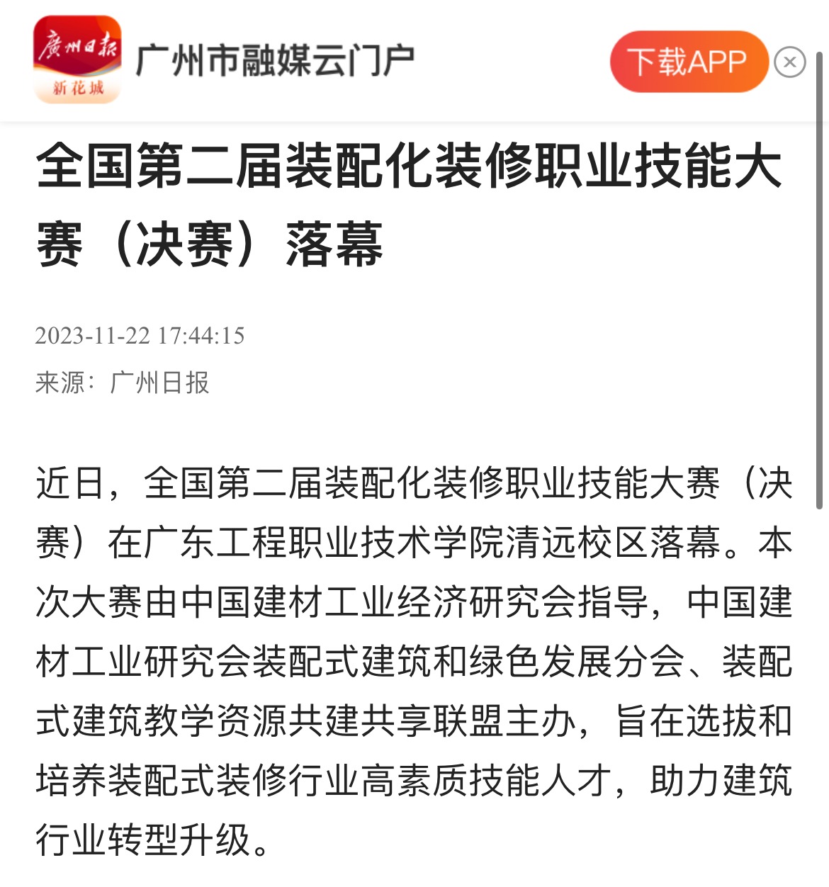 近日,全國第二屆裝配化裝修職業(yè)技能大賽(決賽)在廣東工程職業(yè)技術(shù)學院清遠校區(qū)落幕。本次大賽由中國建材工業(yè)經(jīng)濟研究會指導,中國建材工業(yè)研究會裝配式建筑和綠色發(fā)展分會、裝配式建筑教學資源共建共享聯(lián)盟主辦,旨在選拔和培養(yǎng)裝配式裝修行業(yè)高素質(zhì)技能人才,助力建筑行業(yè)轉(zhuǎn)型升級。