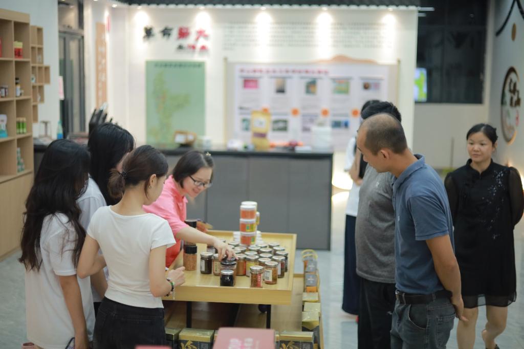 目前圩鎮(zhèn)客廳還作為浮山電商產(chǎn)業(yè)園區(qū),集電商運營、產(chǎn)品展示、直播帶貨等多功能于一體。電商團隊與園區(qū)負責人進行了深入座談,系統(tǒng)調(diào)研行業(yè)發(fā)展現(xiàn)狀。詳細了解了圩鎮(zhèn)客廳的發(fā)展歷程、運營模式以及未來規(guī)劃,以及當?shù)蒯u料行業(yè)的基本情況與核心。近年來,隨著人們生活水平的提高和對美食的追求,特色醬料市場需求不斷增長,但同時也面臨著品牌知名度不高、銷售渠道有限等問題。這些寶貴的“一線聲音”,讓大學(xué)生們對鄉(xiāng)村振興背景下特色產(chǎn)業(yè)如何尋找破局之道有了更深刻的思考。