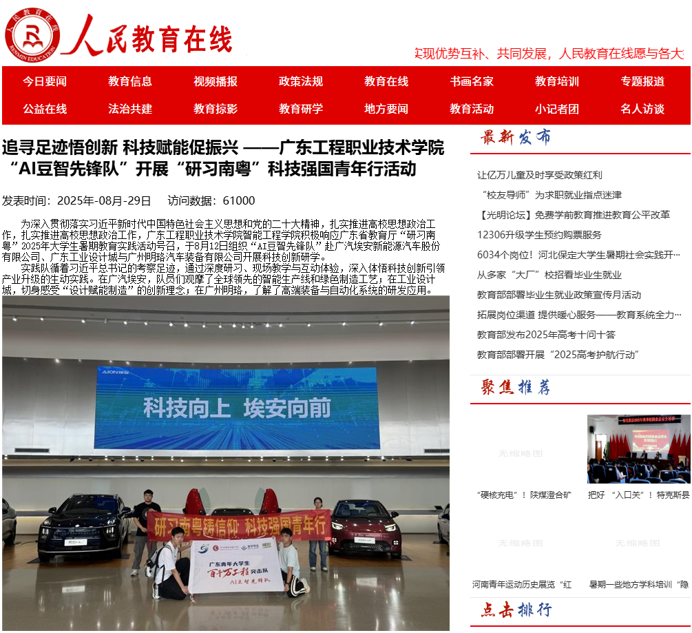 為深入貫徹落實(shí)習(xí)近平新時(shí)代中國(guó)特色社會(huì)主義思想和黨的二十大精神,扎實(shí)推進(jìn)高校思想政治工作,扎實(shí)推進(jìn)高校思想政治工作,廣東工程職業(yè)技術(shù)學(xué)院智能工程學(xué)院積極響應(yīng)廣東省教育廳“研習(xí)南粵”2025年大學(xué)生暑期教育實(shí)踐活動(dòng)號(hào)召,于8月12日組織“AI豆智先鋒隊(duì)”赴廣汽埃安新能源汽車股份有限公司、廣東工業(yè)設(shè)計(jì)城與廣州明珞汽車裝備有限公司開展科技創(chuàng)新研學(xué)。
