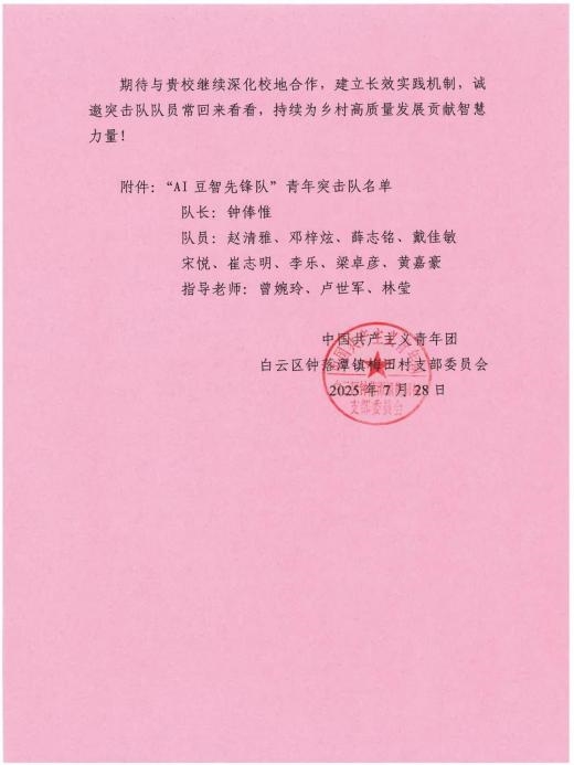 通過校地企共建、田間實(shí)戰(zhàn)與紅色教育深度融合,團(tuán)隊(duì)構(gòu)建起“研習(xí)南粵—從化經(jīng)驗(yàn)—白云實(shí)戰(zhàn)”賦能鏈,形成“需求-攻堅(jiān)-落地”百日閉環(huán),真正實(shí)現(xiàn)從課堂學(xué)習(xí)到田野服務(wù)的有效跨越。目前,“豆智昂揚(yáng)”智能體已服務(wù)農(nóng)戶超200家農(nóng)戶,并獲得政府表揚(yáng)信及廣東電視臺(tái)、中國(guó)教育網(wǎng)、中華網(wǎng)等20多家主流媒體報(bào)道,成為科技賦能鄉(xiāng)村振興的一項(xiàng)生動(dòng)實(shí)踐。