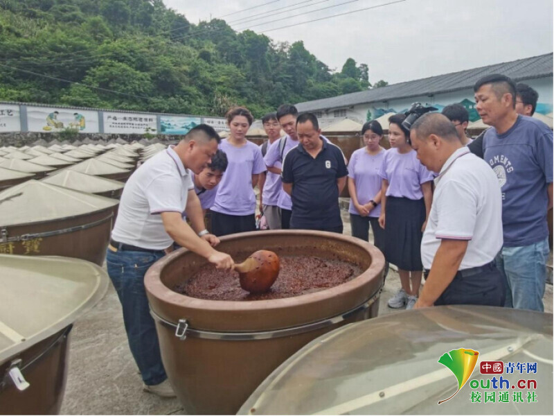 圖為團(tuán)隊(duì)成員近距離觀看并了解醬油的生產(chǎn)過程。鄧梓炫 供圖
