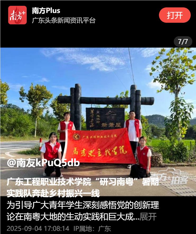為引導廣大青年學生深刻感悟黨的創(chuàng)新理論在南粵大地的生動實踐和巨大成就,堅定不移聽黨話、跟黨走。近日,廣東工程職業(yè)技術學院馬克思主義學院組織青年學生利用暑期積極投身社會實踐,通過所見所聞在南粵大地上感悟思想偉力。