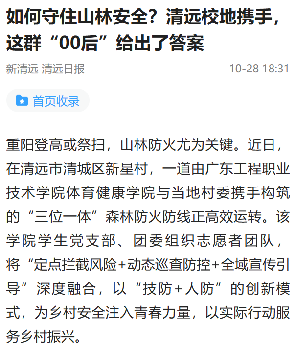 重陽登高或祭掃,山林防火尤為關(guān)鍵。近日,在清遠市清城區(qū)新星村,一道由廣東工程職業(yè)技術(shù)學(xué)院體育健康學(xué)院與當(dāng)?shù)卮逦瘮y手構(gòu)筑的“三位一體”森林防火防線正高效運轉(zhuǎn)。該學(xué)院學(xué)生黨支部、團委組織志愿者團隊,將“定點攔截風(fēng)險+動態(tài)巡查防控+全域宣傳引導(dǎo)”深度融合,以“技防+人防”的創(chuàng)新模式,為鄉(xiāng)村安全注入青春力量,以實際行動服務(wù)鄉(xiāng)村振興。