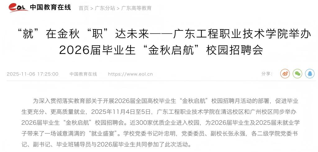 為深入貫徹落實(shí)教育部關(guān)于開(kāi)展2026屆全國(guó)高校畢業(yè)生“金秋啟航”校園招聘月活動(dòng)的部署,促進(jìn)畢業(yè)生更充分、更高質(zhì)量就業(yè),2025年11月4日至5日,廣東工程職業(yè)技術(shù)學(xué)院在清遠(yuǎn)校區(qū)和廣州校區(qū)同步舉辦2026屆畢業(yè)生“金秋啟航”校園招聘會(huì)。近300家優(yōu)質(zhì)企業(yè)進(jìn)入校園,為2026屆畢業(yè)生及2025屆未就業(yè)學(xué)子帶來(lái)了一場(chǎng)誠(chéng)意滿滿的“就業(yè)盛宴”。學(xué)校黨委書(shū)記葉忠明,黨委委員、副校長(zhǎng)張永強(qiáng),各二級(jí)學(xué)院黨委書(shū)記、副書(shū)記、畢業(yè)班輔導(dǎo)員與2026屆畢業(yè)生共同參加了此次活動(dòng)。