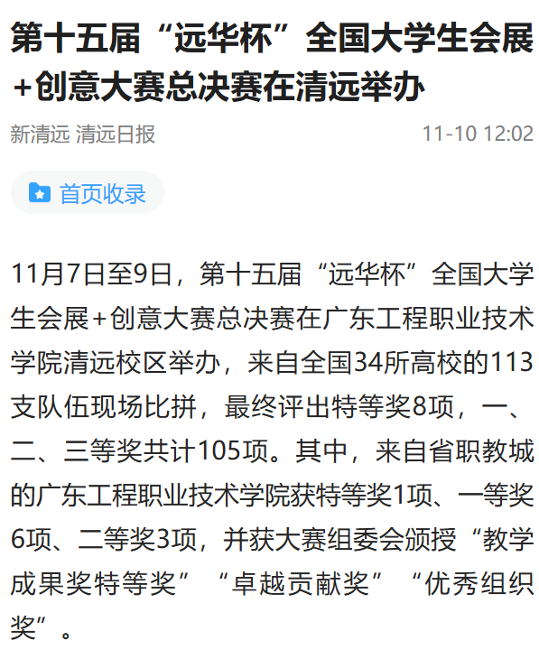 11月7日至9日,第十五屆“遠(yuǎn)華杯”全國大學(xué)生會展+創(chuàng)意大賽總決賽在廣東工程職業(yè)技術(shù)學(xué)院清遠(yuǎn)校區(qū)舉辦,來自全國34所高校的113支隊伍現(xiàn)場比拼,最終評出特等獎8項,一、二、三等獎共計105項。其中,來自省職教城的廣東工程職業(yè)技術(shù)學(xué)院獲特等獎1項、一等獎6項、二等獎3項,并獲大賽組委會頒授“教學(xué)成果獎特等獎”“卓越貢獻(xiàn)獎”“優(yōu)秀組織獎”。