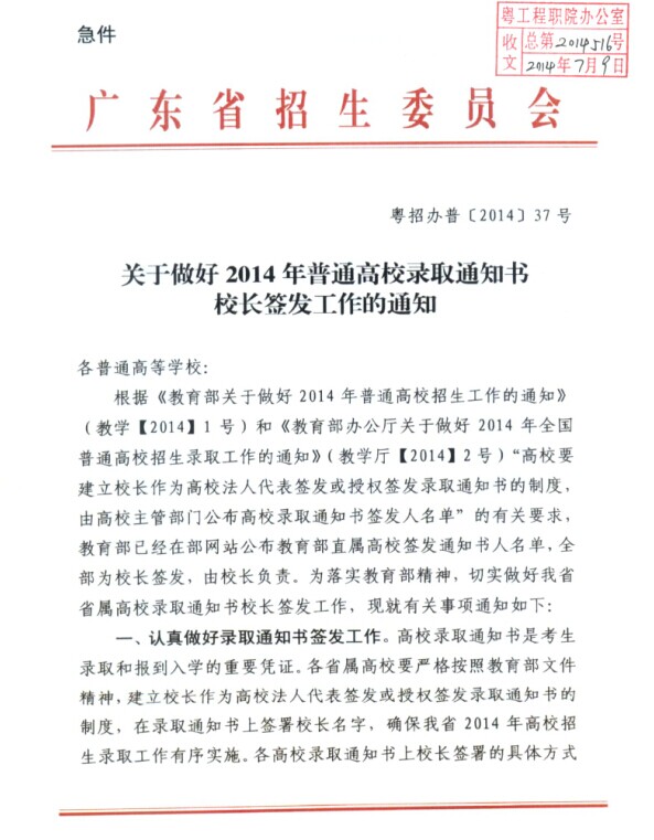 勞漢生校長簽發(fā)廣東工程職業(yè)技術(shù)學(xué)院2014年普高新生錄取通知書公告