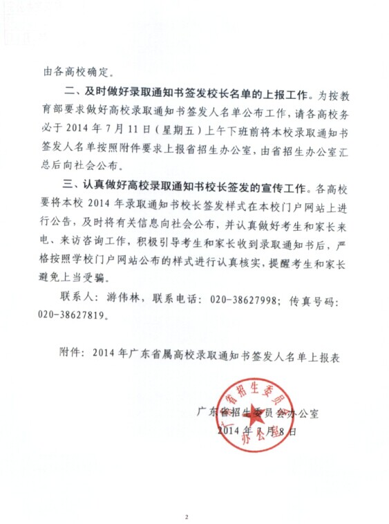 2014年7月8日我校接到廣東省招生委員會緊急通知《關(guān)于做好2014年普通高校錄取通知書校長簽發(fā)工作的通知》(粵招辦普﹝2014)37號文),要求各普通高等學(xué)校認(rèn)真做好高校錄取通知書校長簽發(fā)工作,并將本校2014年錄取通知書校長簽發(fā)樣式在本校門戶網(wǎng)站上進(jìn)行公告,積極引導(dǎo)考生及家長收到錄取通知書后,嚴(yán)格按照學(xué)校門戶網(wǎng)站公布的樣式進(jìn)行認(rèn)真核實,提醒考生和家長避免上當(dāng)受騙。我校嚴(yán)格執(zhí)行廣東省招生委員會要求,在所有2014年普高新生錄取通知書上加蓋校長勞漢生簽名章,望考生及家長及時參照比對確認(rèn),避免上當(dāng)受騙,特此公告。